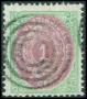1873. 1 c. grøn/lilla med 4-ring stp.