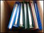 TILBEHØR. Kasse med indstiksbog samt tykt ringbind.
