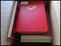 LAGER. Kasse med diverse bøger med ældre materiale og bag i bogen.