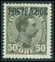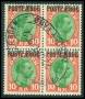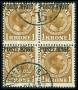 1919. 1 kr. gulbrun overtrykstype 3 i 4-blok med filatelistisk efterstempling København (19)24. Trykbestemmelse Jørgensen.