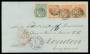 1864. 2 sk. blå tryk 5 og 4 sk. rød tryk 11 i 3-stribe på brev fra Helsingør til England. Attest LN.