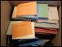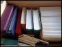 TILBEHØR. Flyttekasse med diverse bøger med lidt indlæg af danske 4-blokke, ubrugte udvalgshæfter og mappeholdere m.m.