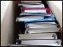 Flyttekasse med diverse i bøger, æsker og mapper.