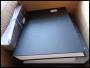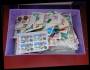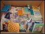 Flyttekasse med poser med frimærker, en del Thule sæt og plancher m.m.