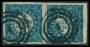 1852. 2 RBS blå Thiele pl. II-29/30 type 5+6 i par, lille indklip (4 mm.) mellem mærkerne. Sign. K.P.K. og R. Calves. Attester K.P.K og CAM. Excellent.
